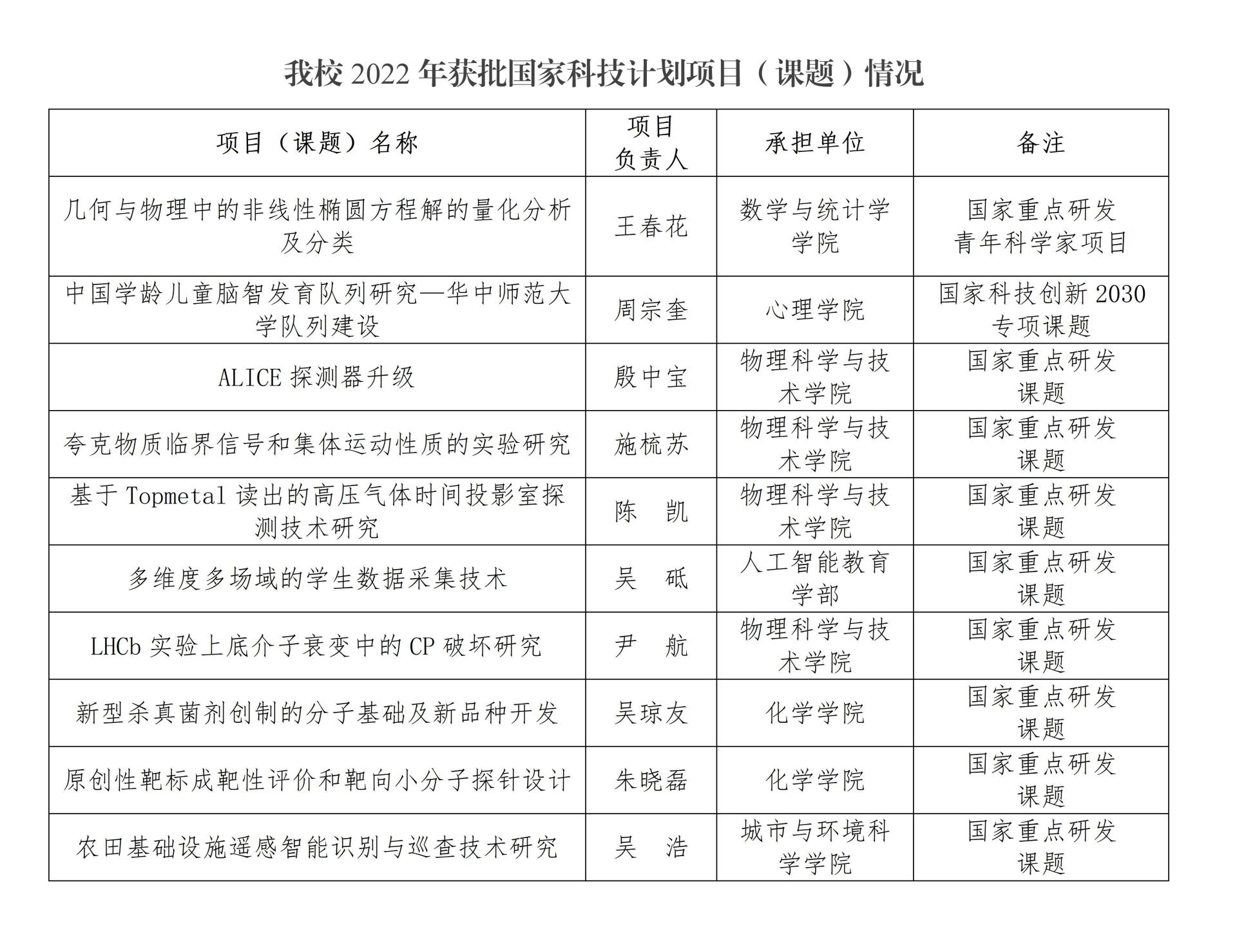华大在线讯(通讯员 王珏 朱潇潇)近日,科技部陆续公布2022年度“国家重点研发计划”专项、“国家科技创新2030”重大专项立项资助名单。开云足球体育获批各类国家科技计划项目(课题)24项,其中重点专项1项,课题9项,子课题14项。截至目前,开云足球体育2022年共获得国家科技计划经费8300多万元,较上年度增长225%。立项项目(课题)主要分布在应用数学、绿色农药、高能物理、脑科学、遥感科学与技术以及人工智能教育等领域。