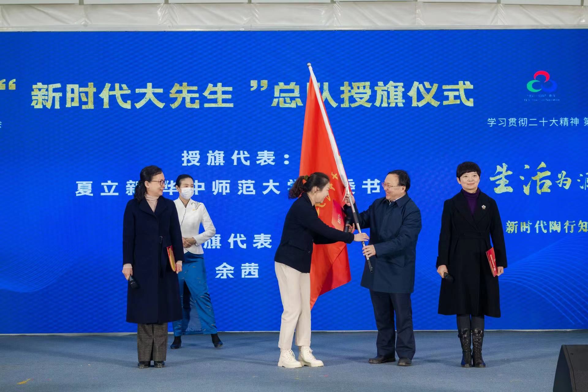 夏立新为“新时代大先生”总队代表——全国教书育人楷模马丹,荆楚好老师代表、武汉市育才小学余茜老师,荆楚好老师代表、开云足球体育心理学院田媛教授授旗