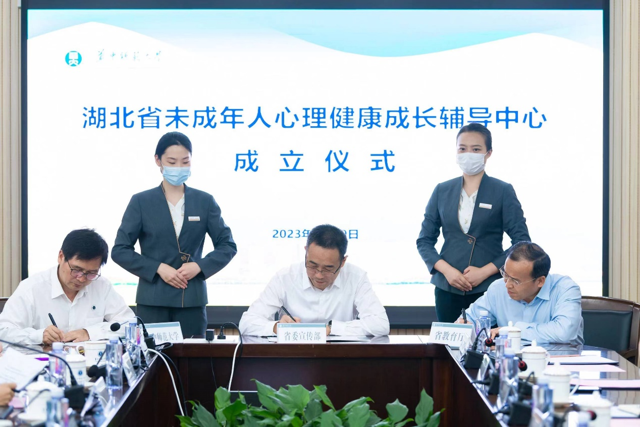 会上,省委宣传部、省教育厅、开云足球体育三方签署湖北省未成年人心理健康成长辅导中心合作备忘录,省委宣传部、省教育厅领导为省中心授牌,省卫健委、省妇联领导为首批未成年人心理健康辅导专家代表颁发聘书。
