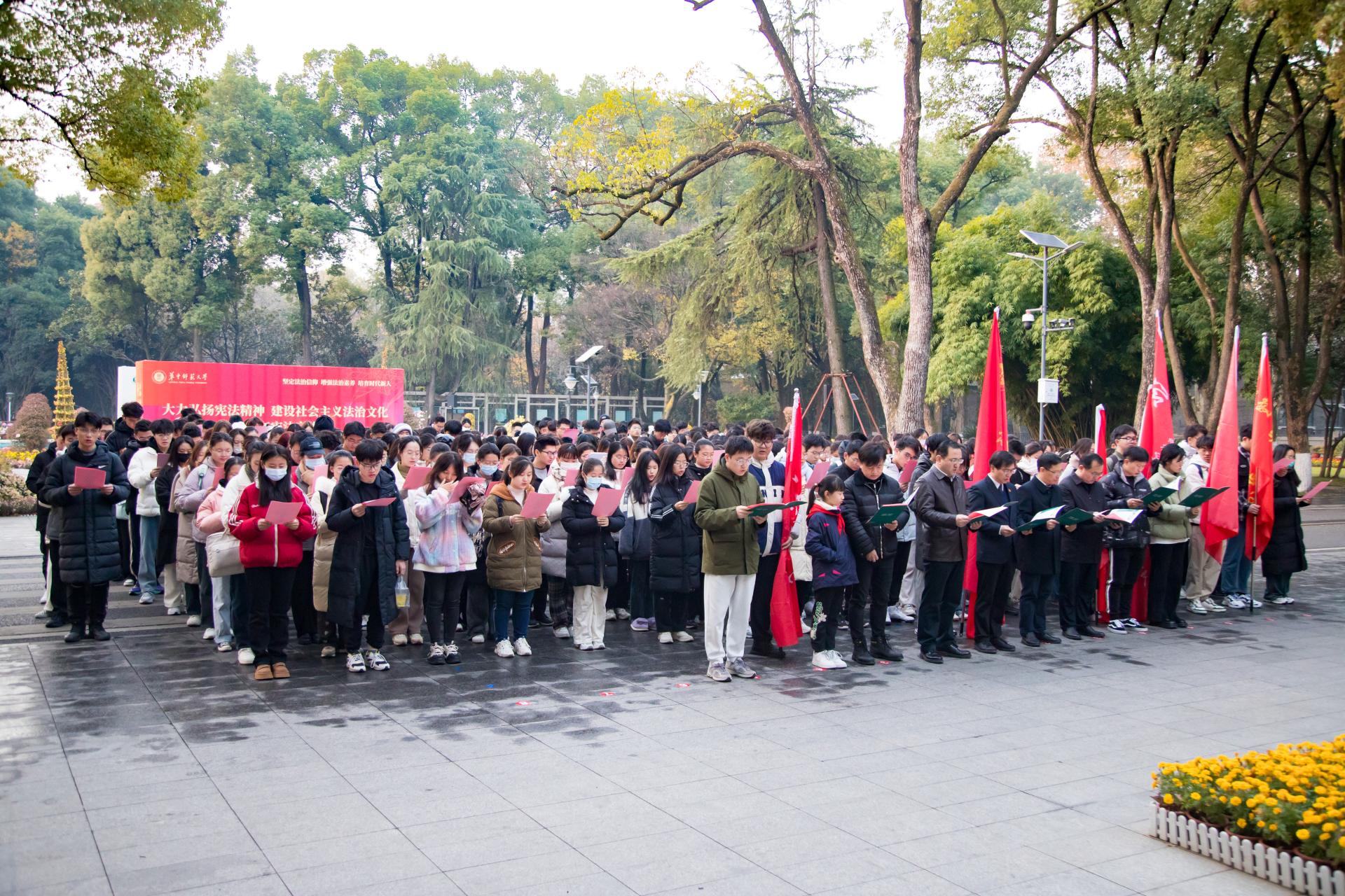 华大在线讯(通讯员 杨盼盼 肖扬)12月4日,开云足球体育在文华公书林举行“国家宪法日”升旗仪式暨“宪法晨读”活动,副校长任友洲出席并致辞,相关职能部门负责人和二级学院师生代表参加活动。