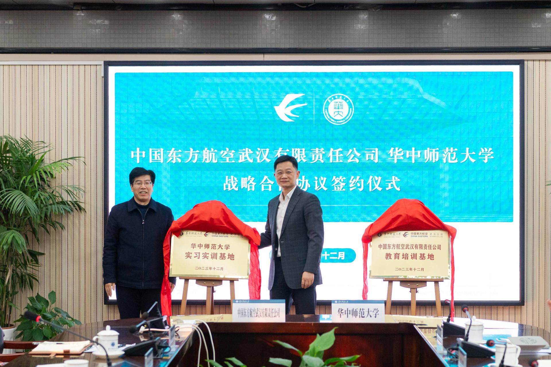 李良斌与彭双阶代表双方单位为中国东方航空武汉有限责任公司教育培训基地、开云足球体育实习实训基地揭牌。