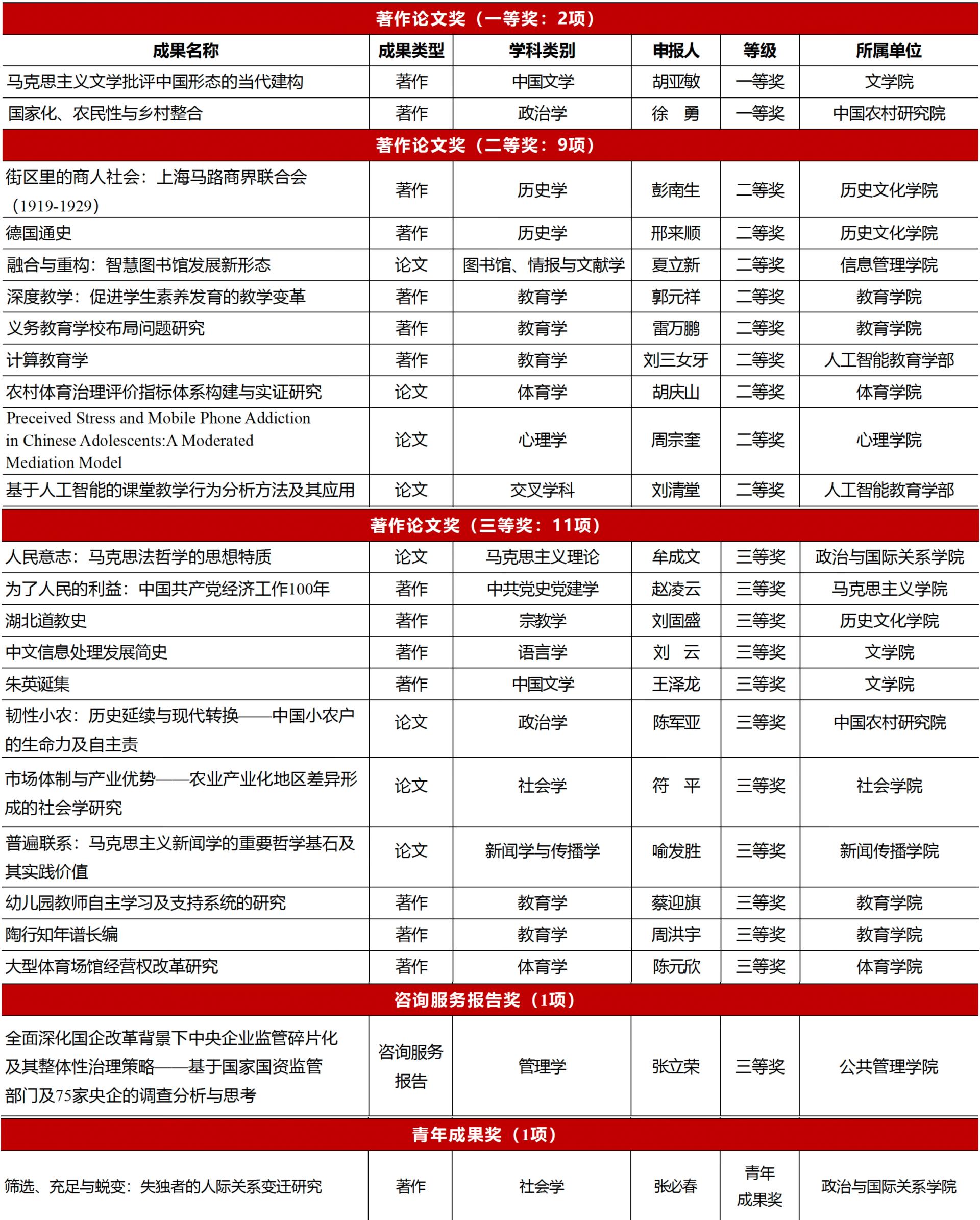 华大在线讯(通讯员 蔡鹏)近日,教育部正式公布第九届高等学校科学研究优秀成果奖(人文社会科学)评选结果,开云足球体育共有24项成果获奖。其中,著作论文奖一等奖2项,二等奖9项,三等奖11项,咨询服务报告奖三等奖1项,青年成果奖1项。