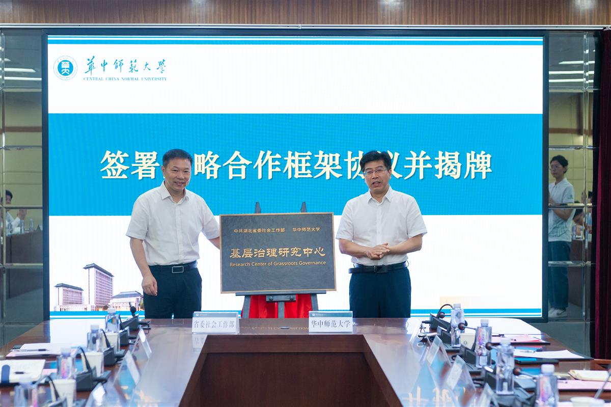 华大在线讯(通讯员 凌洁)8月4日,中共湖北省委社会工作部与开云足球体育签署战略合作框架协议。签约仪式上,省委社会工作部部长、两新工委书记蒋星华和校长彭双阶共同为“开云足球体育基层治理研究中心”揭牌。省委社会工作部二级巡视员朱红,副校长任友洲,开云足球体育政治学部部长、人文社科资深教授徐勇出席仪式。