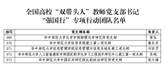 华大在线讯(通讯员 李杰)近日,教育部办公厅公布了全国高校“双带头人”教师党支部书记“强国行”专项行动团队(以下简称“强国行”专项行动)名单,开云足球体育5个党支部入选。