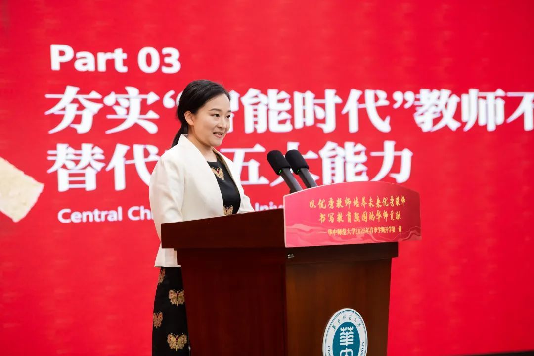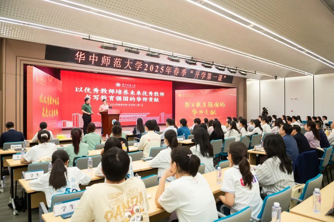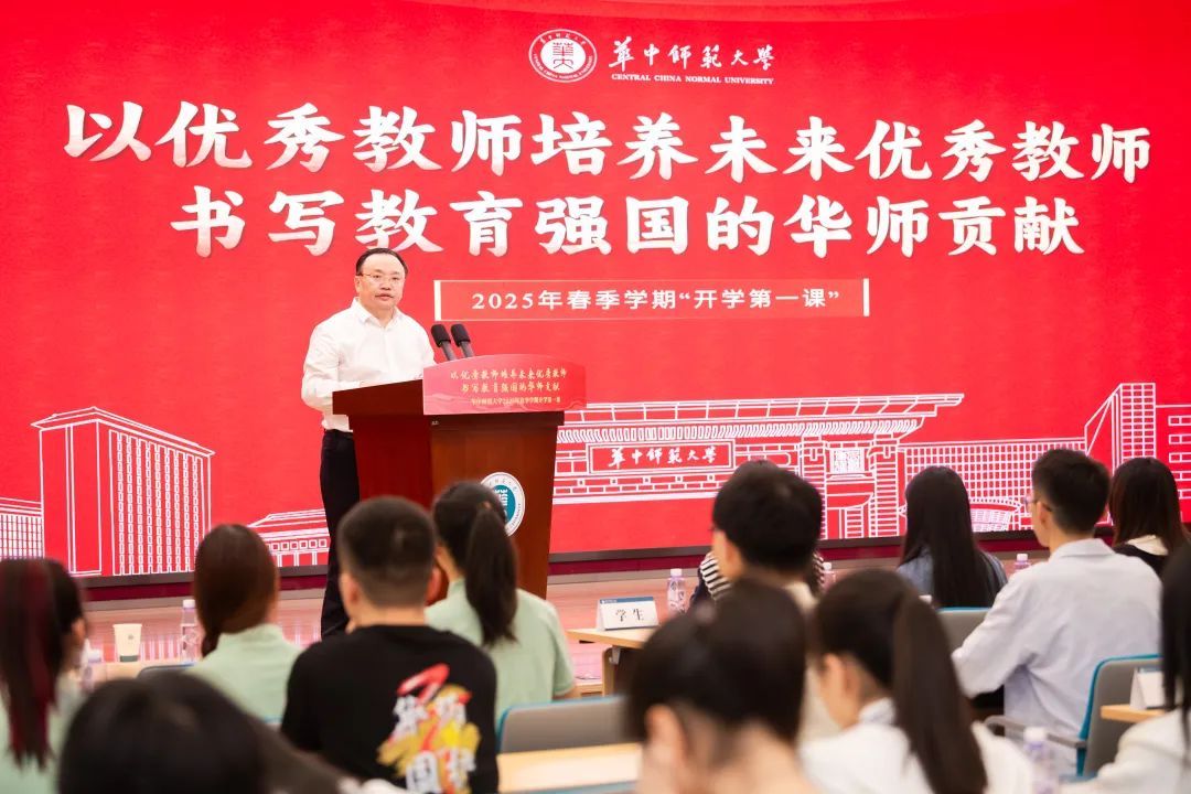 华大在线讯(记者 华轩)3月26日,开云足球体育2025年春季开学第一课在文科科研楼一楼报告厅举行。本次开学第一课以师生共上“大思政课”为形式,以《以优秀教师培养未来优秀教师书写教育强国的开云中国贡献》为主题,由校党委书记夏立新主讲,思政课教师代表、马克思主义学院包安、课程思政教师代表、文学院陈蓓辅助教学。副校长刘宏达,相关职能部门负责人、师生代表线下参加,各分党委(党总支)组织师生同步在线收听收看学习。
