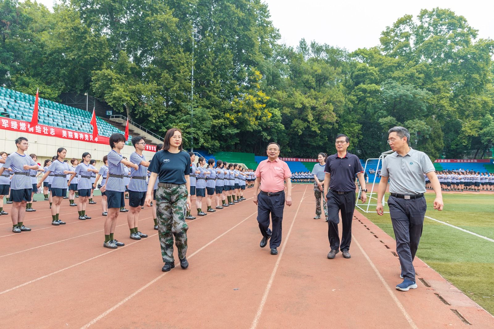 华大在线讯(通讯员 胡一心 李雪琴)近日,校党委书记夏立新、校长彭双阶、校党委副书记陈迪明前往佑铭体育场、南湖田径场看望慰问2025级军训学员、教官及参训干部,观看军训队列训练,与现场带训教官、参训学员、政工干部沟通交流,详细了解军训进度、训练科目、参训人数及后勤保障等情况。