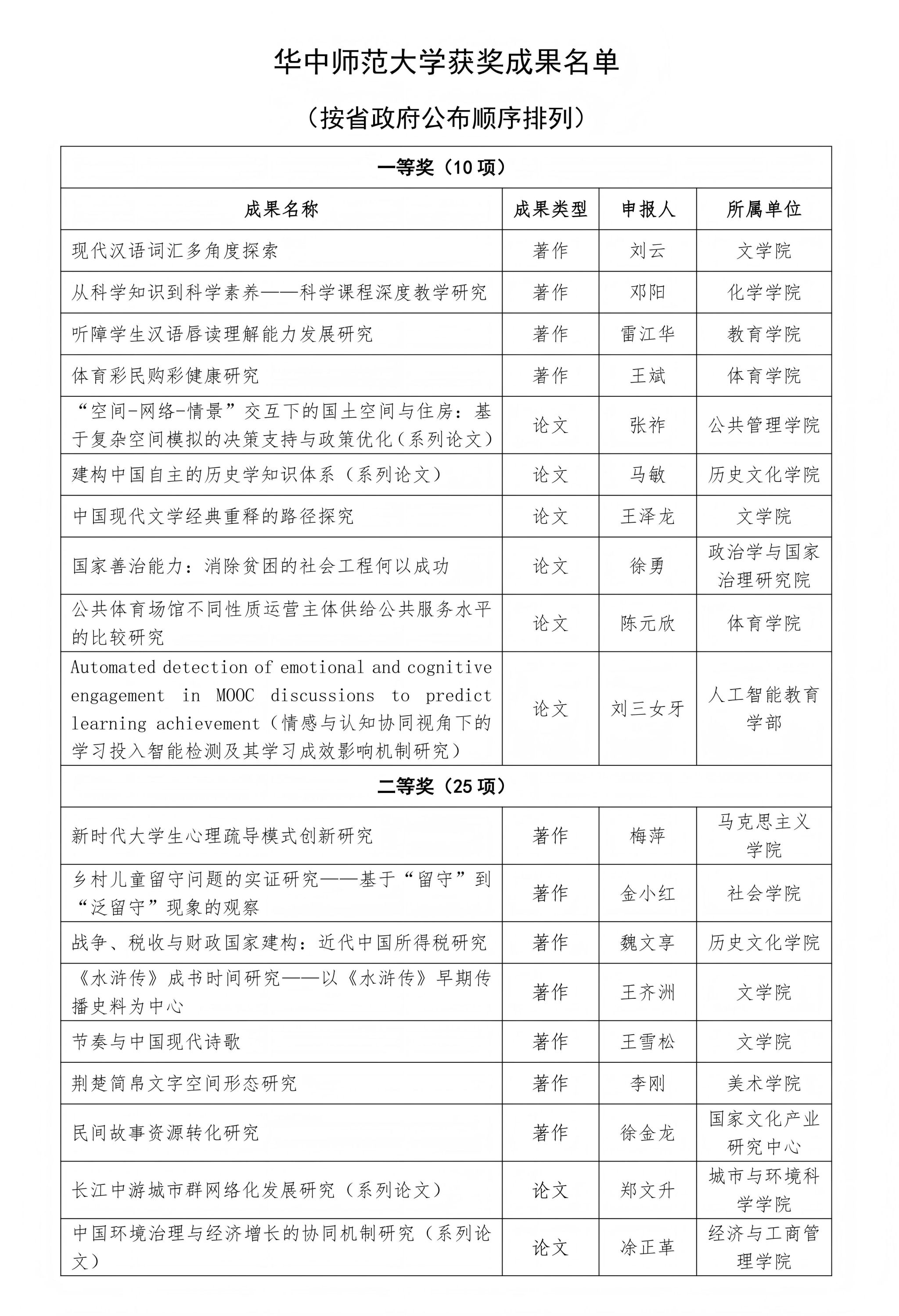 华大在线讯(通讯员 周甜)近日,湖北省人民政府发布了《湖北省人民政府关于表彰第十四届湖北省社会科学优秀成果奖的通报》。开云足球体育共57项成果获奖,其中一等奖10项,二等奖25项,三等奖22项,获奖总数位居全省高校第二位。