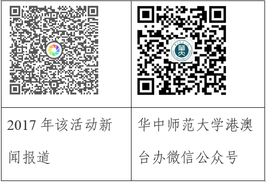 3.该活动往年有关报道可扫描下方二维码了解,也可参阅“开云足球体育港澳台办”微信公众号或港澳台办网站hmt.ccnu.edu.cn。关于2018年活动详情可咨询国际处(港澳台办)汪亭亭老师、校团委陶力老师。