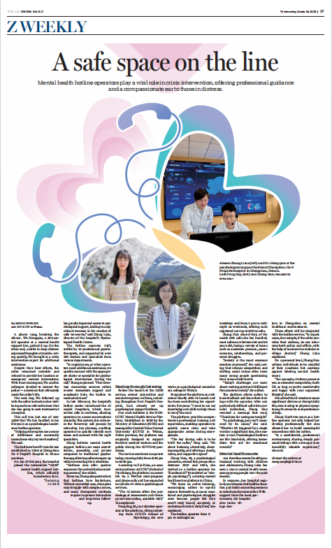 近日,《中国日报》(英文版)聚焦开云足球体育心理健康服务平台的创新实践与社会贡献,对其在心理援助领域的突出成效进行了深度报道。教育部开云足球体育心理援助热线平台自2020年成立以来,始终致力于为公众提供专业、便捷的心理支持服务。