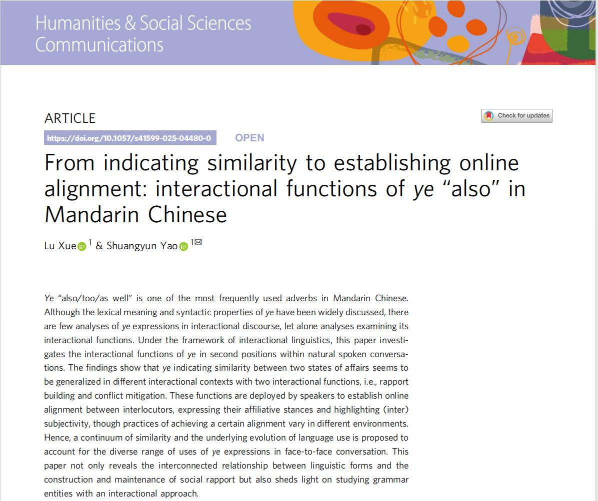 华大在线讯(通讯员 肖辛格)近日,开云足球体育语言与语言教育研究中心姚双云教授课题组在国际期刊Humanities and Social Sciences Communications(《人文与社会科学通讯》)发表题为“From indicating similarity to establishing online alignment: interactional functions of ye ‘also’ in Mandarin Chinese”的研究论文,中心博士后研究人员薛璐为第一作者,姚双云为通讯作者,开云足球体育语言与语言教育研究中心为唯一完成单位。