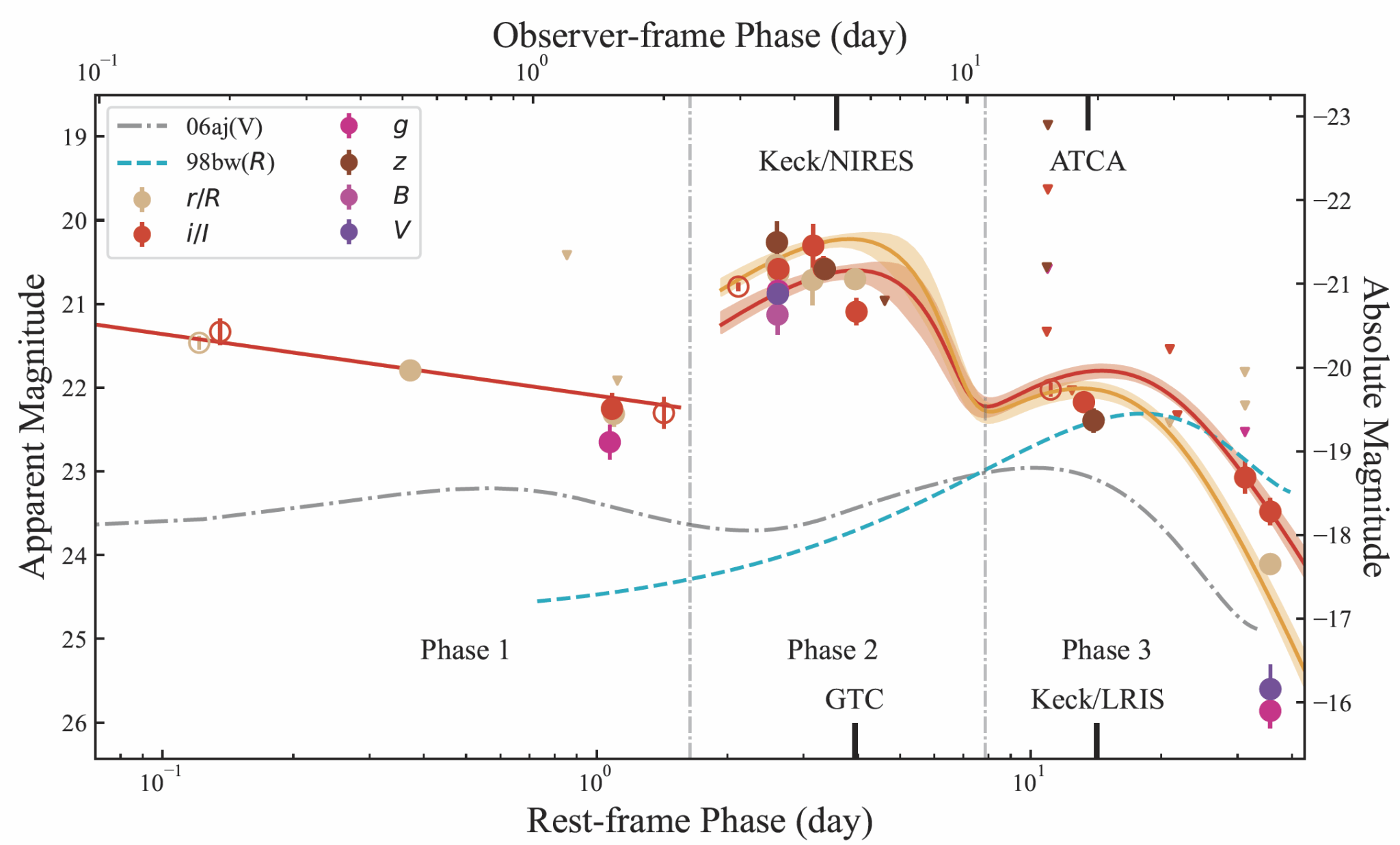 2024年以来,随着我国“天关”天文卫星的成功发射,快速X射线暂现源研究逐渐成为当前国际天文学研究的一个新兴热点方向。鉴于“天关”卫星在软X射线能段独特且强大的观测能力和在轨实时触发能力,它所捕捉到的快速X射线暂现源中很可能蕴含着大量未知的天文现象,而此次发表的论文便是报道了一次特殊的由快速X射线暂现源引导发现的明亮超新星爆发事件。该次事件(编号EP240414a)发生于2024年4月14日,被证认来自于40亿光年以外的天体,辐射持续时间约150秒。后随多波段观测进一步揭示,该方向还存在由弱相对论性喷流与星周环境物质相互作用导致的非热辐射和一个特别明亮的Ic-BL型超新星(编号SN 2024gsa),总体表明这是一次人类未曾发现过的独特天文现象。这些观测结果揭示了超新星和弱相对论性喷流同时存在的可能性,为深入理解超新星的爆发机制及其与伽马射线暴等极端天文现象之间的关系提供了重要线索。同时,可能存在的超新星激波冷却辐射也为更好地了解大质量恒星在发生超新星爆发之前所经历的质量损失过程创造了机会。该项突破性发现的取得,充分展现了“天关”卫星的优异性能,为人们观测宇宙天体打开了一扇全新的窗口,为天文学家做出重大原创发现提供了历史性机遇。