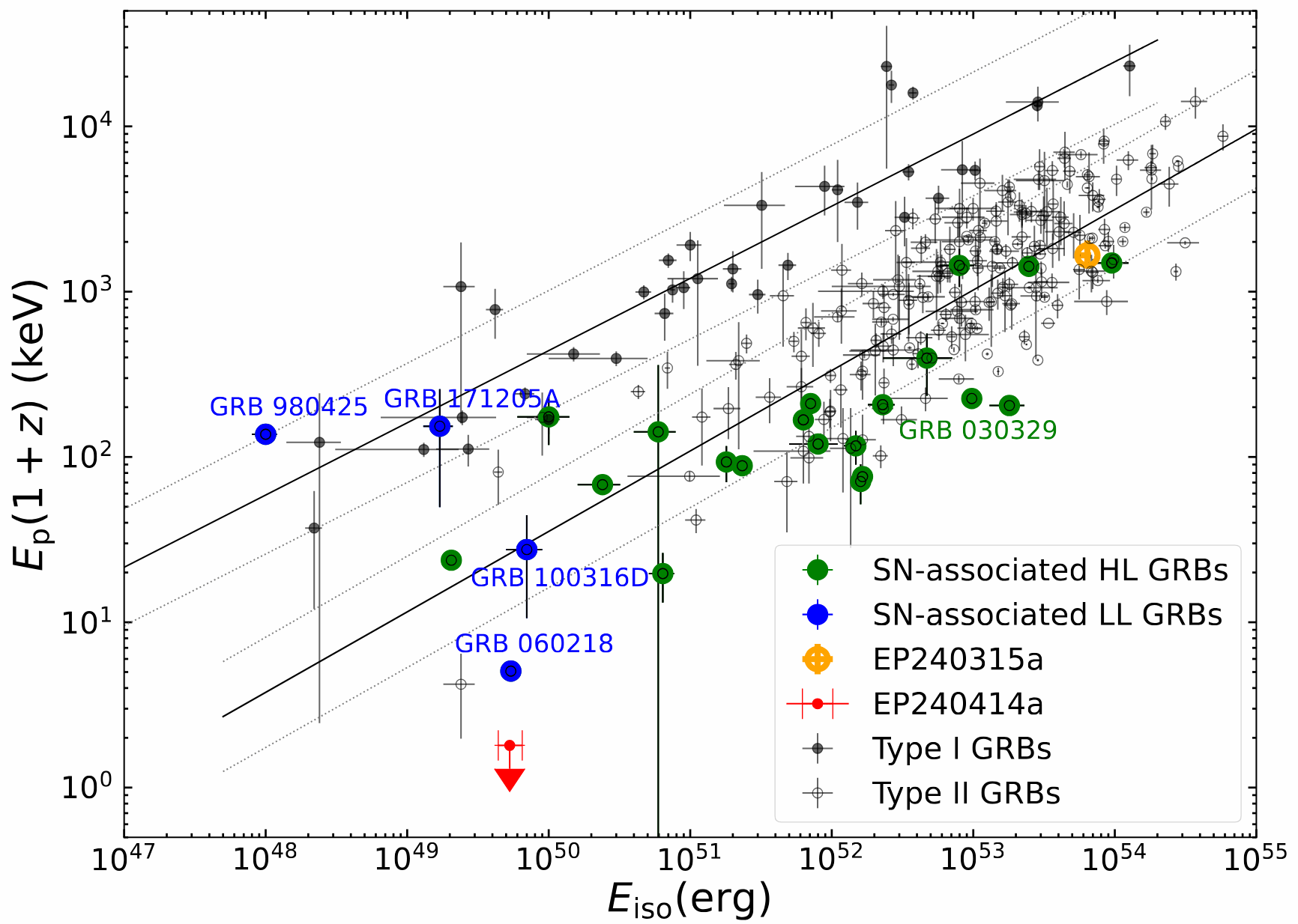 图2 快速X射线暂现源EP240414a在峰值能量和各向同性能量参数空间中的位置(图中红点)