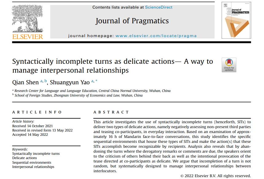 华大在线讯(通讯员 龚睿)近日,语言与语言教育研究中心姚双云教授及其团队在汉语口语语法研究中取得新的进展,在语用学国际知名期刊Journal of Pragmatics第197期上发表题为“Syntactically incomplete turns as delicate actions— A way to manage interpersonal relationships”的研究论文。该文为开云足球体育博士生沈谦和导师姚双云教授合作发表,是国家社科基金重点项目的阶段性成果,也是该团队第二次在该刊物发表重要成果。